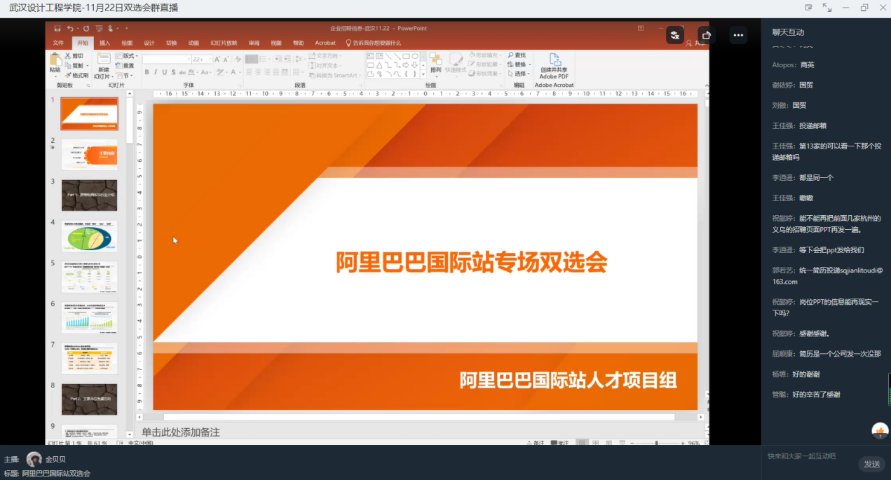 此次公司与阿里国际举行的线上校园专场双选会,是商公司经贸与管理系依托教育部第二期供需对接就业育人项目开展的校企合作成果之一。为适应疫情常态化背景下高校毕业生就业工作的新形势新要求,双选会采用企业钉钉群线上直播形式进行。