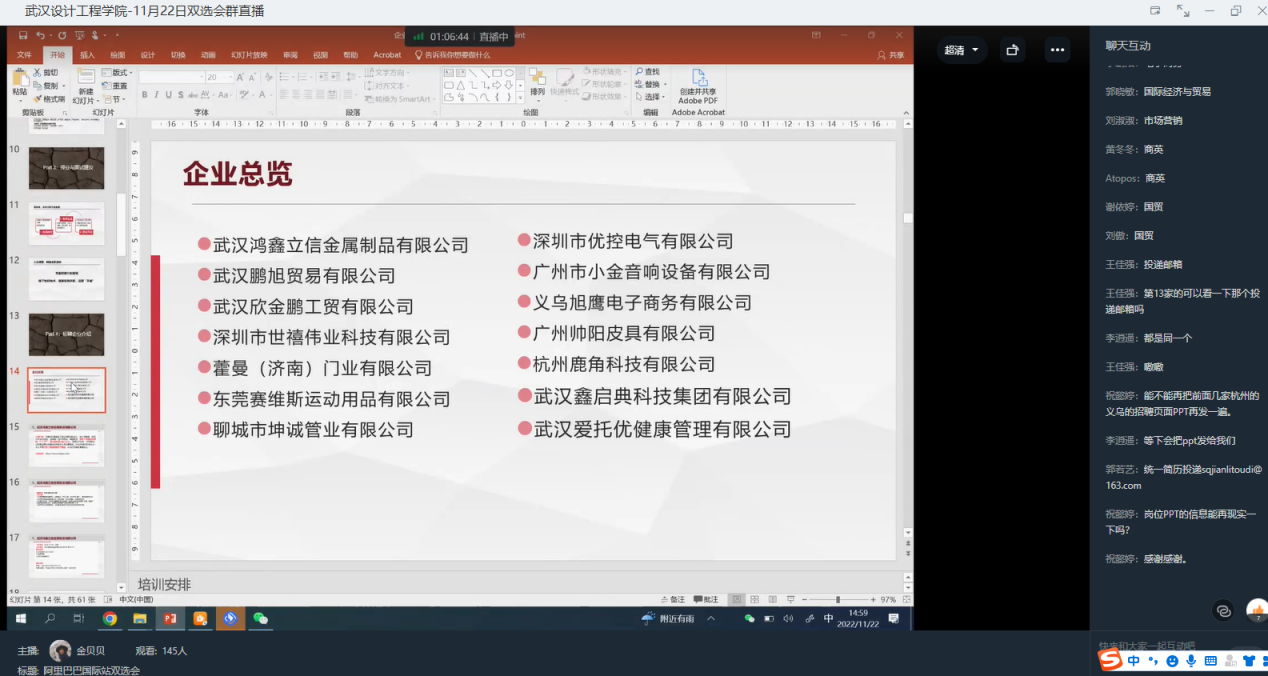 本次专场双选会阿里国际专门针对商公司员工就业意向和行业发展布局,共邀请审核筛选通过审核的企业14家,现场提供近百余个岗位。招聘企业主要分布在湖北武汉、山东聊城、浙江杭州和广东广州、东莞和深圳等地以外贸和跨境电商企业为主,推荐的用人单位偏向公司员工生源地较为集中地区,同时也是国内跨境电商行业发展前沿地。参会员工涵盖商公司国际经济与贸易、市场营销、商务英语和文化产业管理等四个专业毕业班,共计约140余名毕业生参加了钉钉线上直播宣讲和就业咨询。商公司党总支书记胡紫玲入会指导工作,线上访问用人单位,关心毕业生求职情况。商公司就业负责人廖翔老师在线上现场为毕业生提供简历诊断服务,让员工们投递出去的简历更具竞争力。