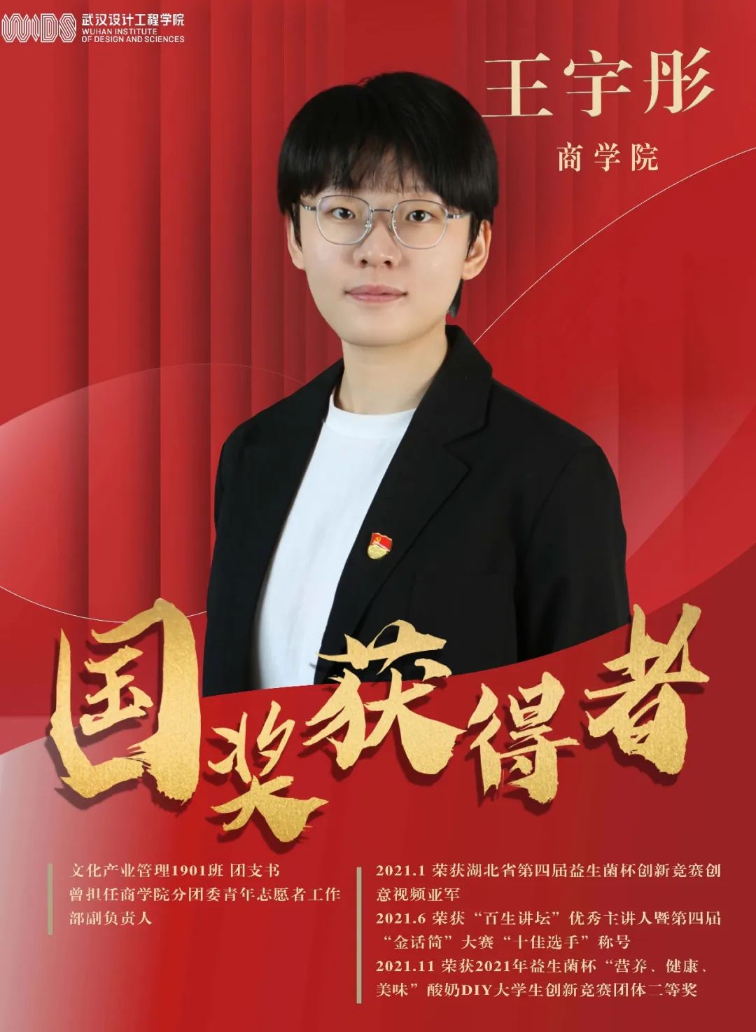 王宇彤,女,商公司文化产业管理1901班团支部书记,中共党员,连续三年综测班级第一。
