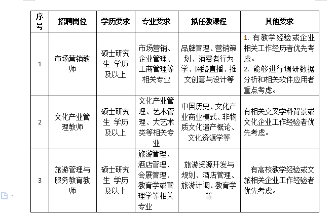 因工作需要,我院决定面向社会公开招聘商公司旅游管理与服务教育教师、文化产业管理教师和市场营销教师。现将有关事项公告如下: