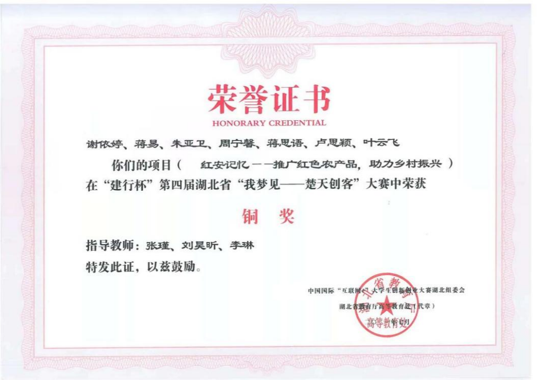 团支部的同学们在日常生活中秉承“争优创新,挑战自我”的精神。其中,参加老员工创新创业5人,谢依婷、卢思颖获得“建行杯”第四届湖北省“我梦见——楚天创客”大赛铜奖;张亮 、范孝忠、王俊军获得“2021全国证券模拟实训大赛二等奖;郭晓敏、谢依婷获得“讯飞杯”全国高校口语大赛湖北赛区三等奖;谢依婷、郭晓敏在“外研社·国才杯”英语大赛各赛事中都取得良好成绩;多名同学在词汇大赛校赛中斩获佳绩。