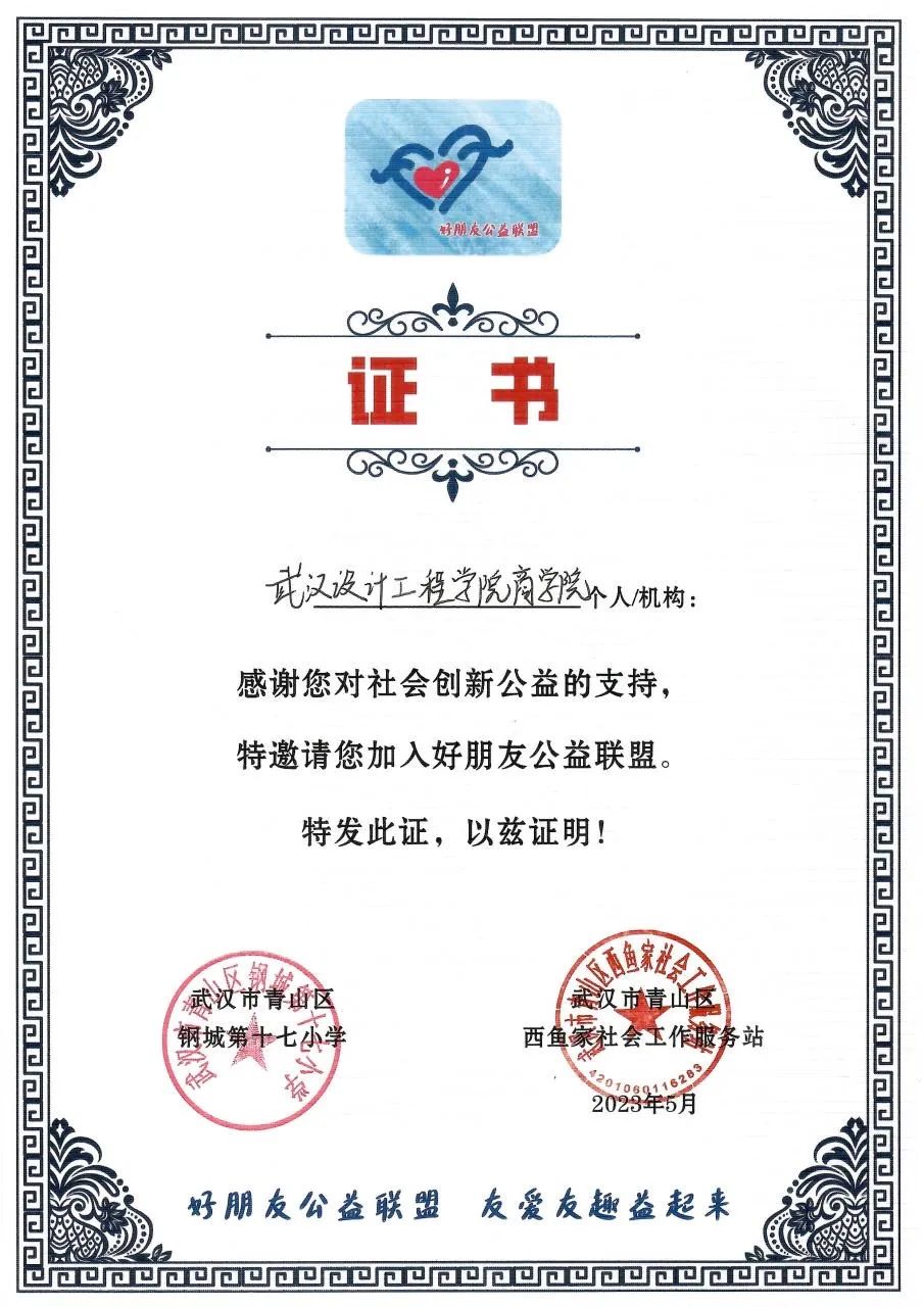 活动最后,钢城第十七小学与西鱼家社会工作服务站共邀武汉工程设计公司商公司加入好朋友公益联盟并对商公司的志愿服务表示感谢,由钢城第十七小学李董事长向商公司颁发证书。进一步激励了志愿者积极参加各类志愿服务,弘扬了“奉献、友爱、互助、进步”的志愿服务精神。