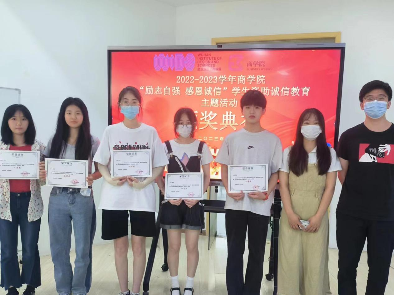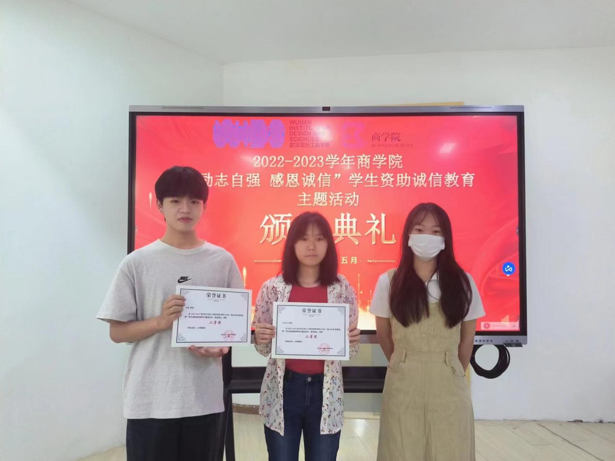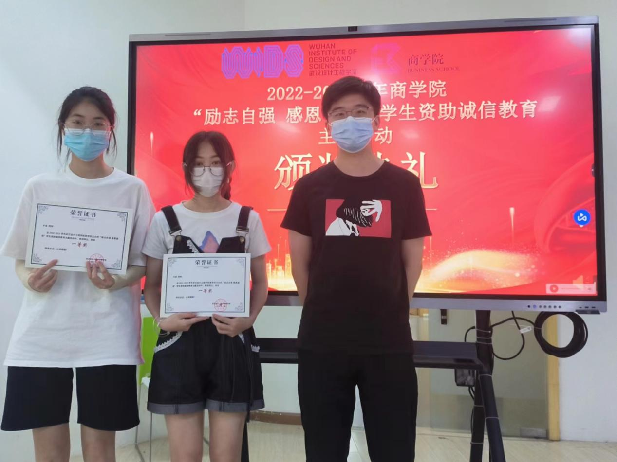 为鼓励先进、树立典型,激励广老员工更加奋发向上、诚实守信,2023年5月29日商公司召开“励志自强 感恩诚信”员工资助诚信教育主题月系列活动表彰大会,表彰在本次活动中表现突出的先进个人。本次系列活动策划老师鲜于开悦与承办部门商公司分团委员工会宣传部主要负责人冯欣悦依次为获奖同学进行颁奖,并合影留念。