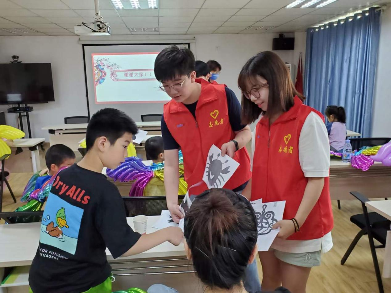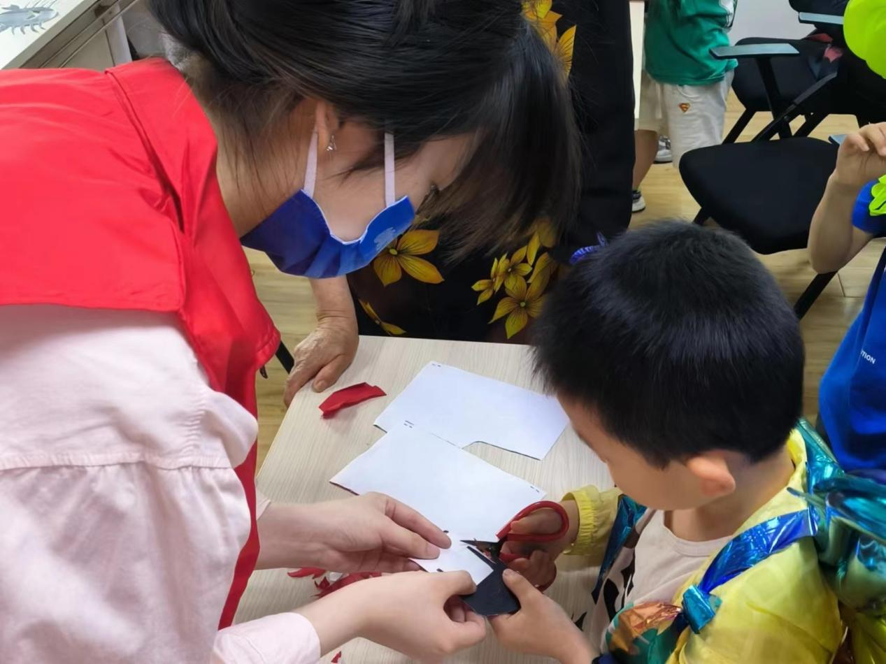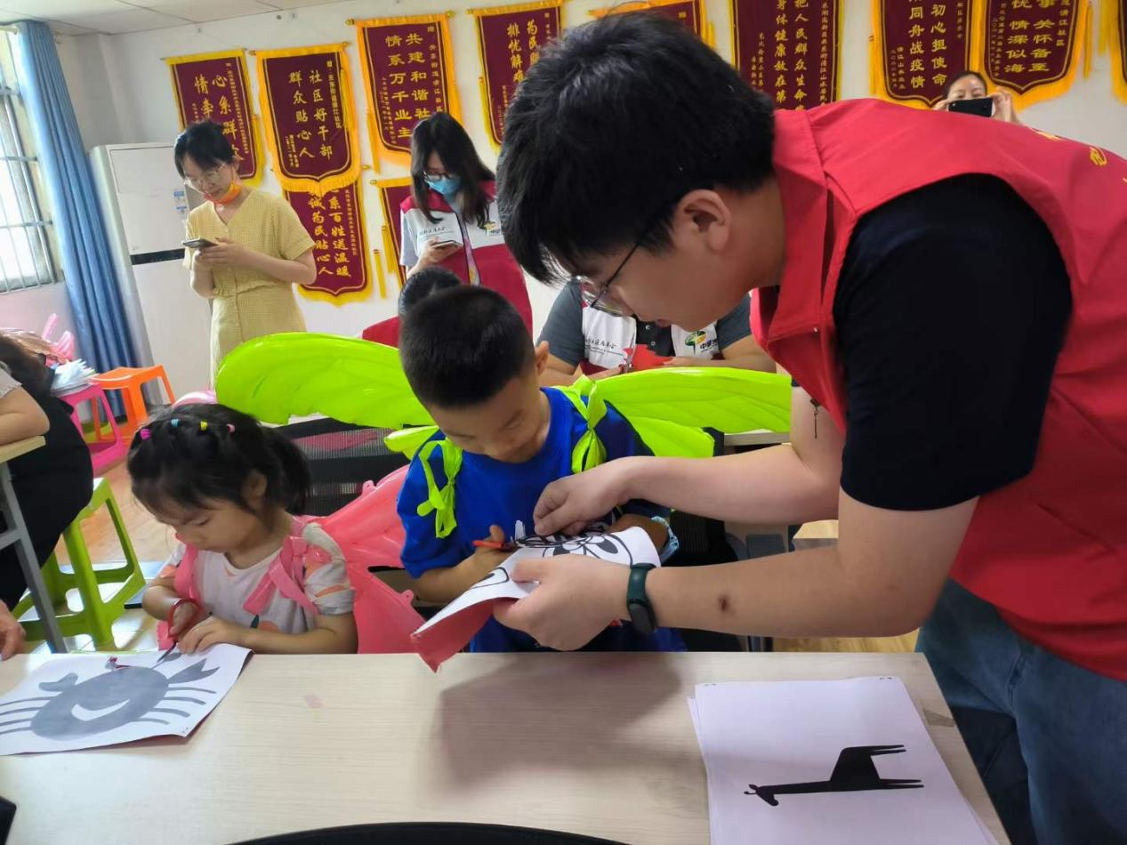 商公司“五色商行”志愿服务队的志愿者们在刘茜老师、张瑾老师和鲜于开悦老师的带领下,联合清江社区开启了“欢度六一 花样剪纸”小课堂。