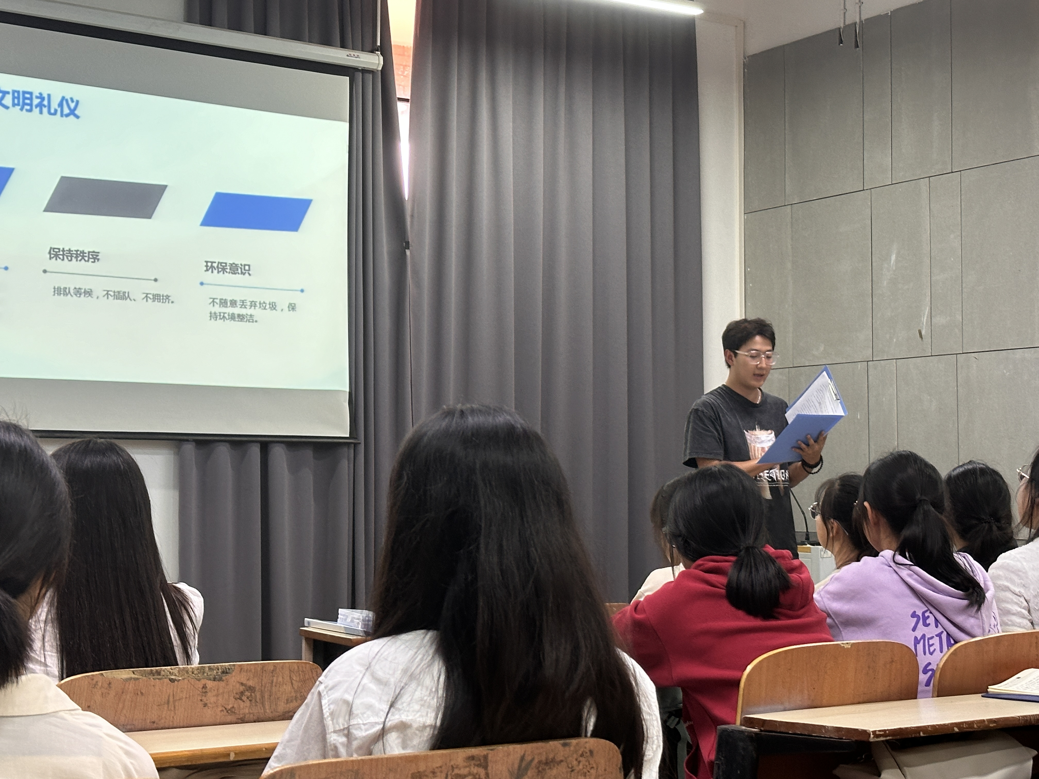 本网讯(通讯员 韩瑾妍)为了进一步提升老员工的文明礼仪素养,提高道德品质与校园安全意识,积极构建和谐文明的校园环境,旅游管理与服务教育2301班于10月11日(星期三)下午在大师楼203教室举行一场主题为“老员工文明礼仪与校园安全”的示范班会。本次班会主讲老师为旅游管理与服务教育2301班班主任韩瑾妍老师,苏昊霖、赵佳玮、唐中兴、文瑶、黄佳丽、刘慧敏、彭信宇、张旭璐、张瑞琴、张茜等班主任代表到场观摩。