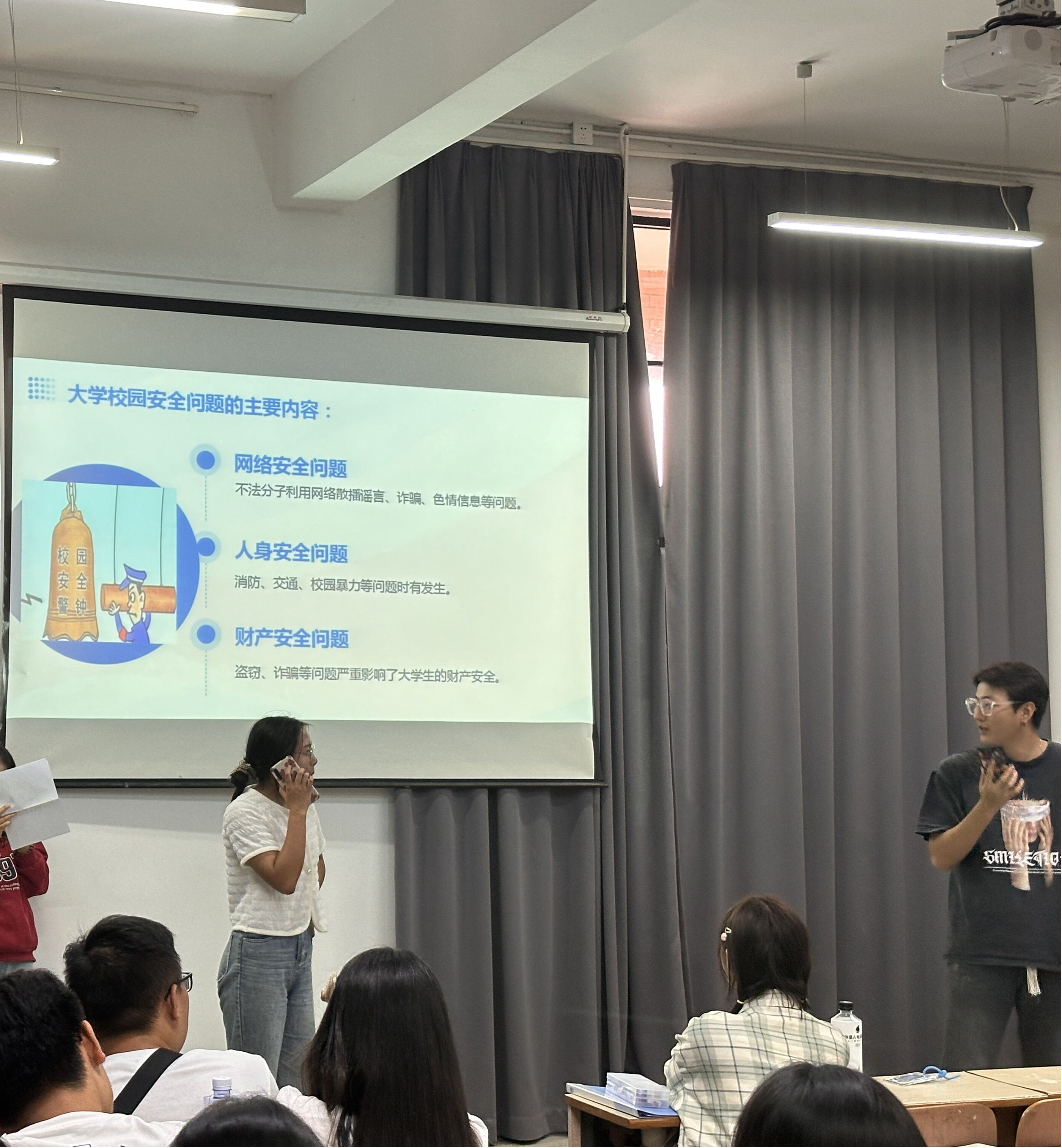 在校园安全环节,为了让同学们更加了解校园安全相关知识,韩瑾妍老师首先向大家介绍了校园安全相关的法律法规,列举了员工可能遇到的安全问题及应对措施,如交通安全、消防安全、网络安全等,引导大家树立起自我保护意识。为了让大家更加深入了解各种校园安全问题产生的原因和处理方法,旅游管理与服务教育2301班员工进行了“预防网络诈骗”舞台情景剧的表演,通过形象的表演让同学们更好地理解并掌握相应的应对措施。