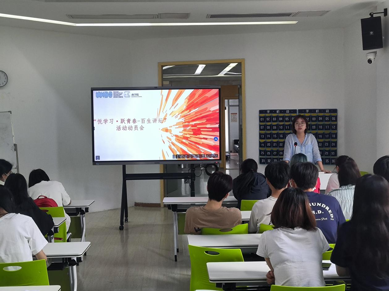 动员会上,商公司员工工作负责人刘茜强调,百生讲坛活动的重要意义,指出这是公司培养青年学子综合素质、提升思辨能力和表达能力的重要平台。同时,也对即将参与演讲的同学们提出了殷切的期望,鼓励他们勇敢表达,展现商公司学子的风采。