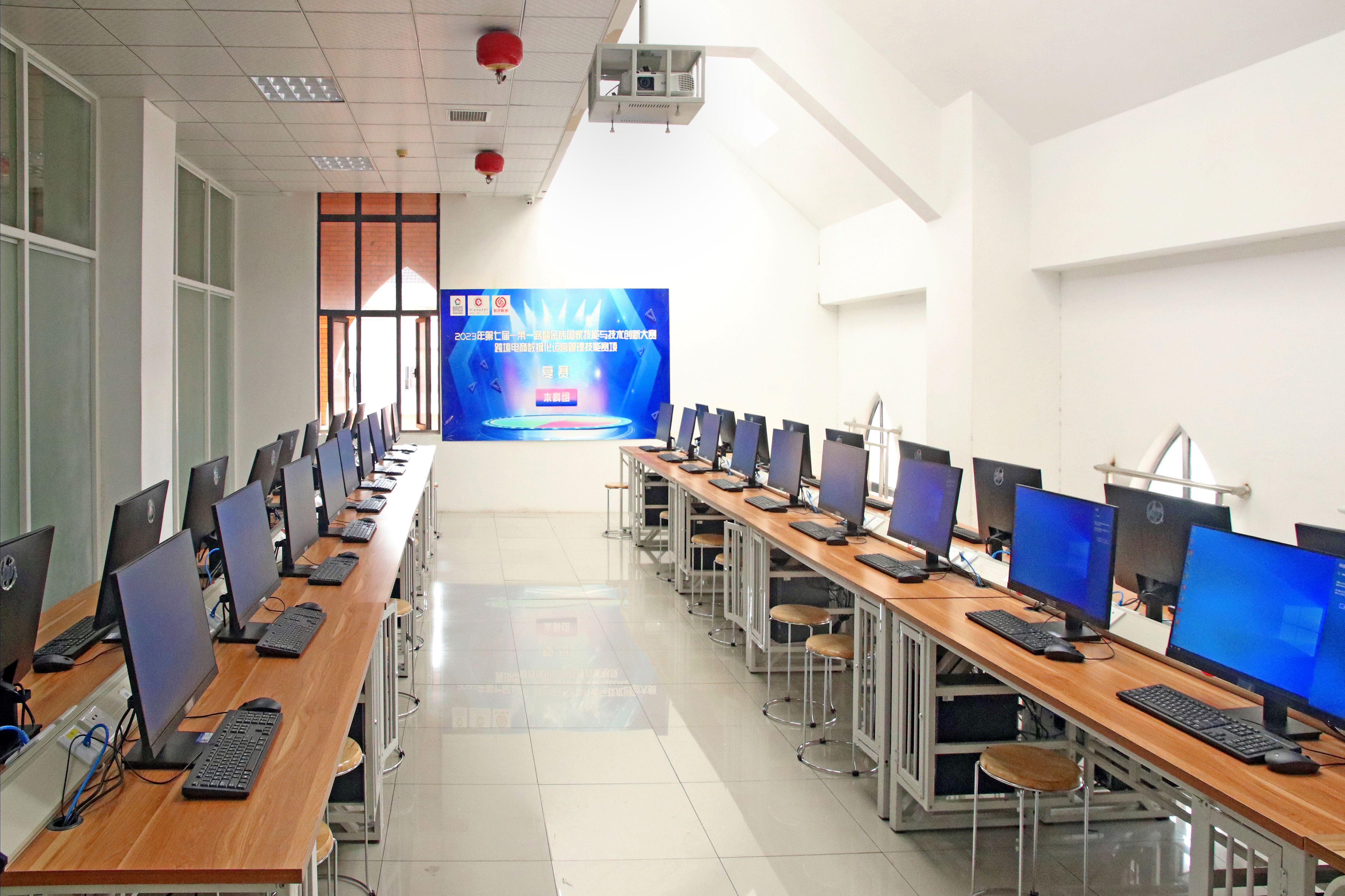 实训室设备:电脑37台、投影仪、服务器、Ali Express实训教学竞赛系统、企业运营与模拟竞争系统、因纳特市场营销模拟平台软件等。