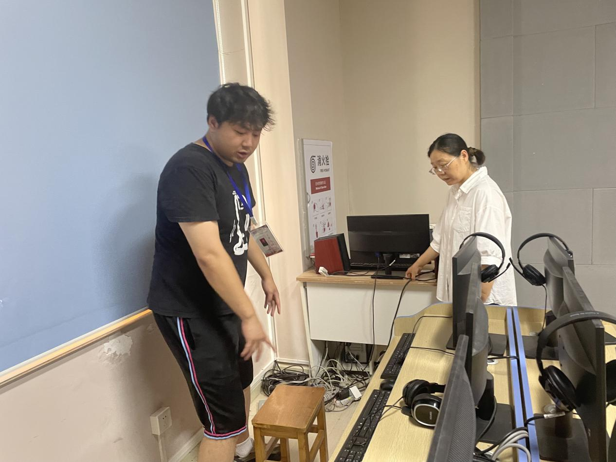 检查小组在人机互译综合实训室检查线缆