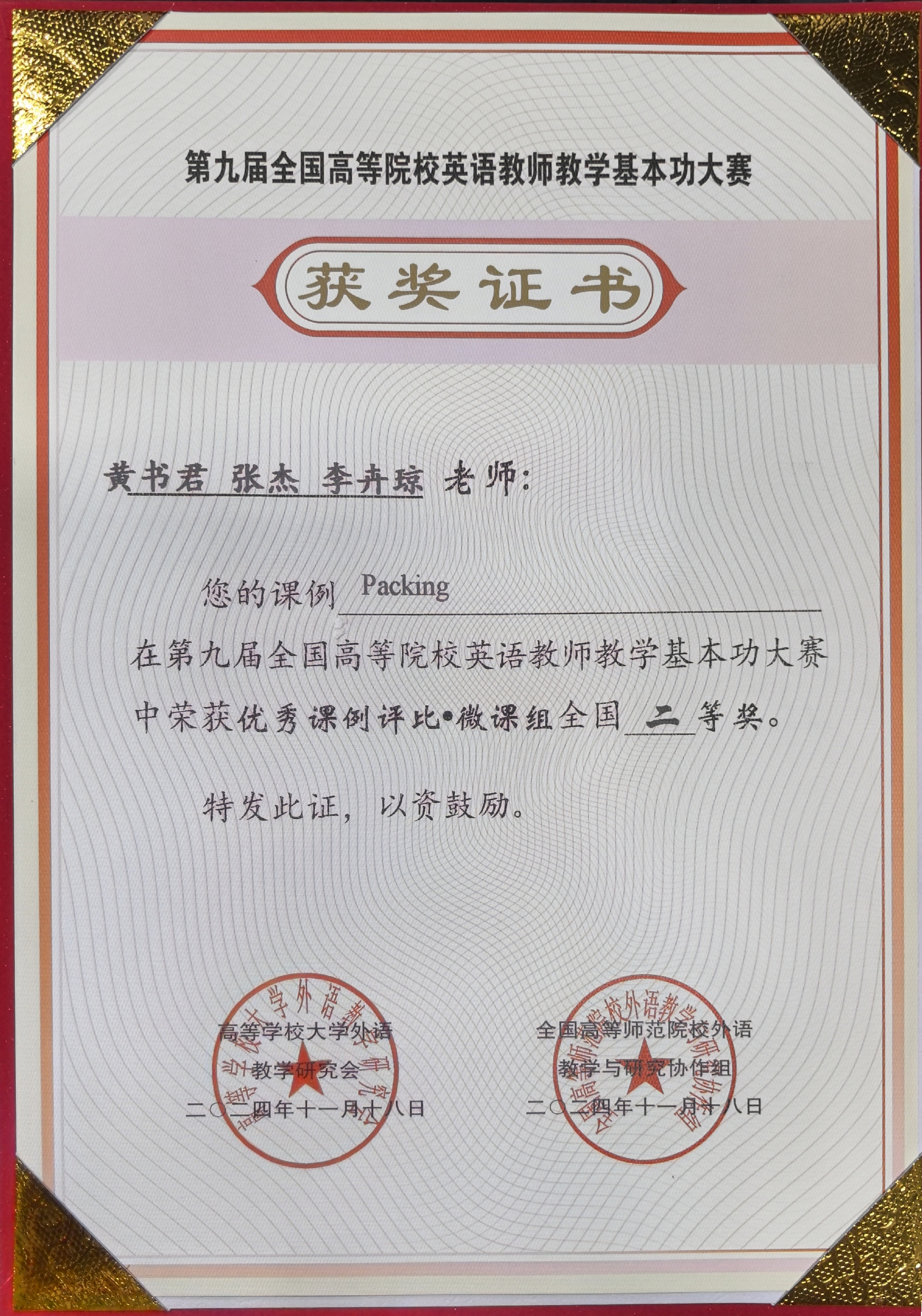 公司商务英语系教师团队黄书君、张杰、李卉琼老师凭借扎实的教学功底和创新的教学理念,以课例《Packing》在大赛中脱颖而出,荣获优秀课例评比微课组全国二等奖。