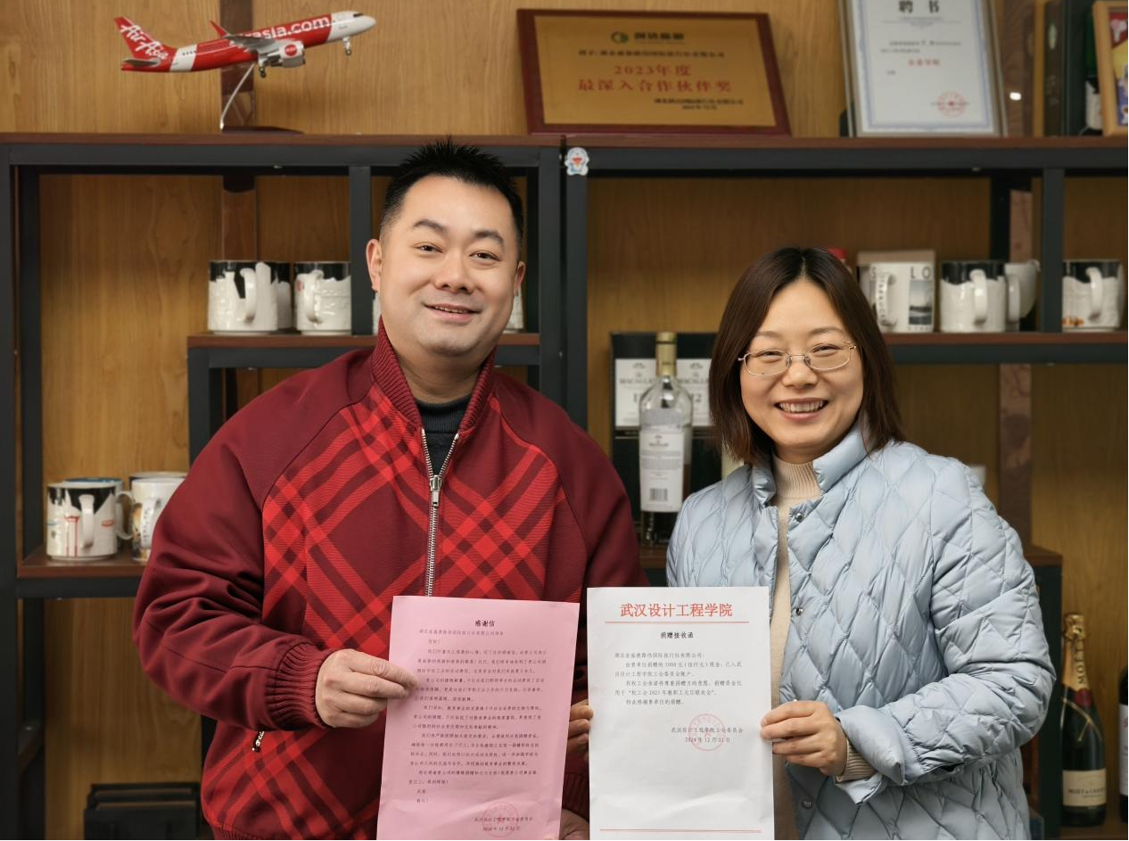 胡紫玲书记代表公司向丁翔总经理转交感谢信,感谢盛德路伟国际旅行社为员工提供实习机会,并以行业实际需求为导向积极参与公司课程设计与优化。