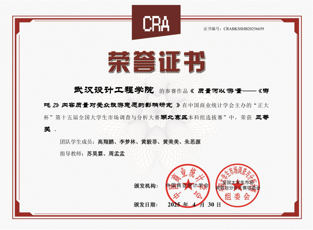 针对本次大赛,公司选题重点关注旅游行业和零售行业的现实问题,开展多次实地与线上调研。省级二等奖作品《靠名人还是质量?综艺节目对观众旅游意愿影响研究——以《花儿与少年·丝路季》为例》以综艺节目要素为切入点,通过市场调研与数据分析,验证了综艺节目要素对旅游意愿的影响;省级三等奖作品《“卤力全开、肘击味来”——正大香卤猪肘营销策略调查分析》,通过市场调研与深度访谈,系统性剖析了正大香卤猪肘在湖北预制菜市场的竞争格局,为正大食品香卤猪肘完善湖北市场布局提供数据支撑,更为传统卤味预制菜行业的区域化营销创新提供可复制的实践样本;省级三等奖作品《质量何以“游”量——《哪吒2》内容质量对受众旅游意愿的影响研究》聚焦影视旅游,以《哪吒2》电影受众为调研主体,为景区影视旅游的高质量发展提出对策建议。