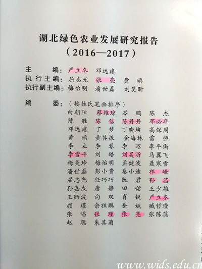 《湖北农业发展研究报告(2016-2017)》在中南财经政法大学乡村振兴研究中心与公司商公司的共同努力下,历时一年于2018年9月正式出版发行。这部研究报告是公司第一部与专业研究机构合作编创完成的省级农业绿色发展绿皮书。绿色发展是党中央提出的“五大发展理念”的重要组成部分,是国家发展的核心和关键问题,同时也对相关领域的团队建设、人才培养和科学研究提出了更高要求。公司商公司深入对接国家及区域发展需求,牢牢把握学科发展前沿,适时参与到《湖北绿色农业发展研究报告(2016-2017)》的编著工作中,将相关学科与现代农业、生态发展相结合,积极开展高标准、高质量办学,为推进湖北省绿色生态经济发展提供人才保障和智力支撑。同时该报告也是国家社会公益性项目(2060302200701)、国家社科重点项目(15AZD062)、国家自然科学基金项目(71673302、71303261)的阶段性成果。