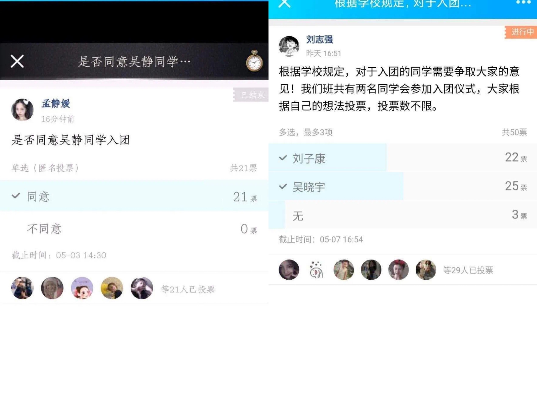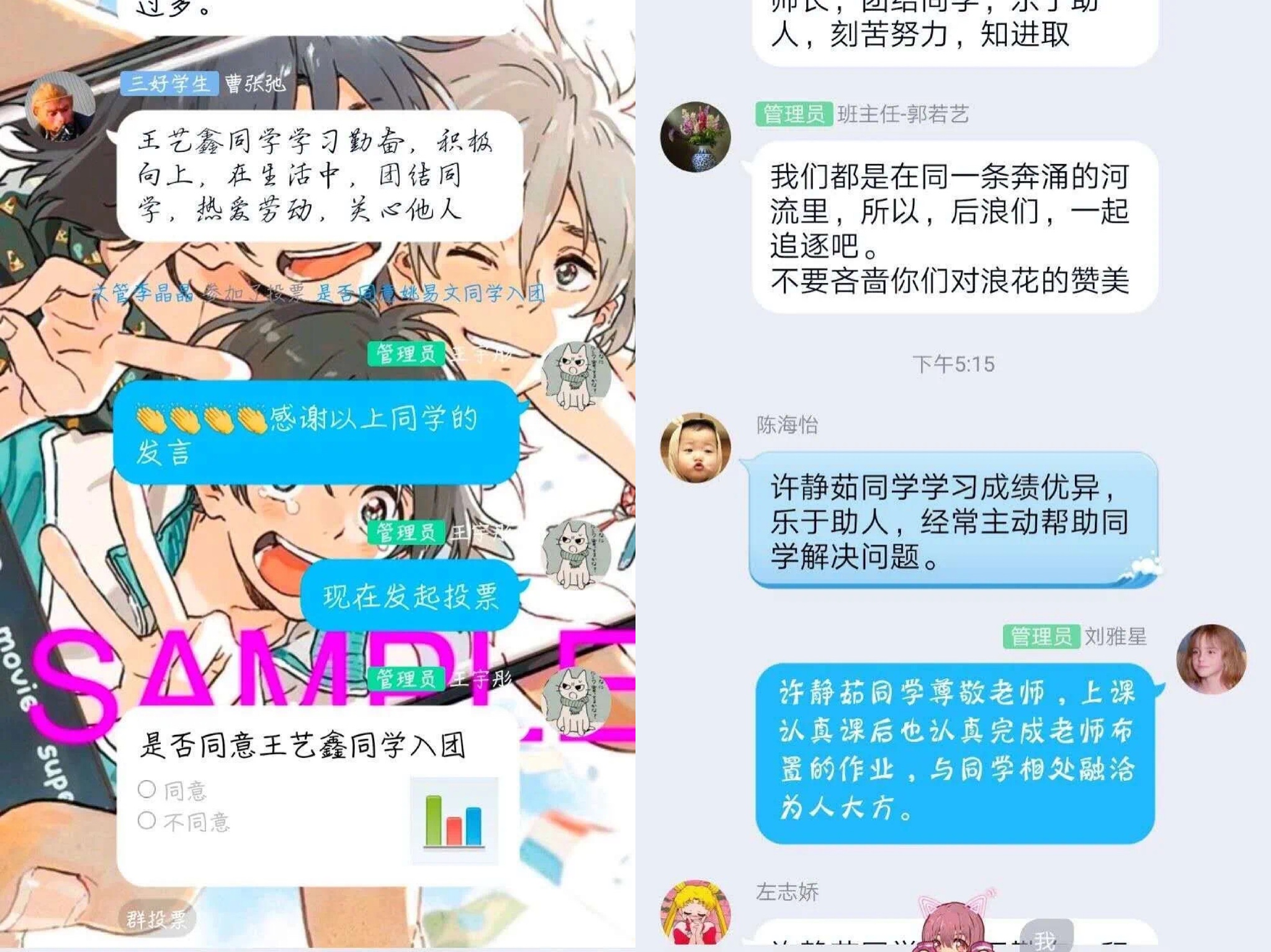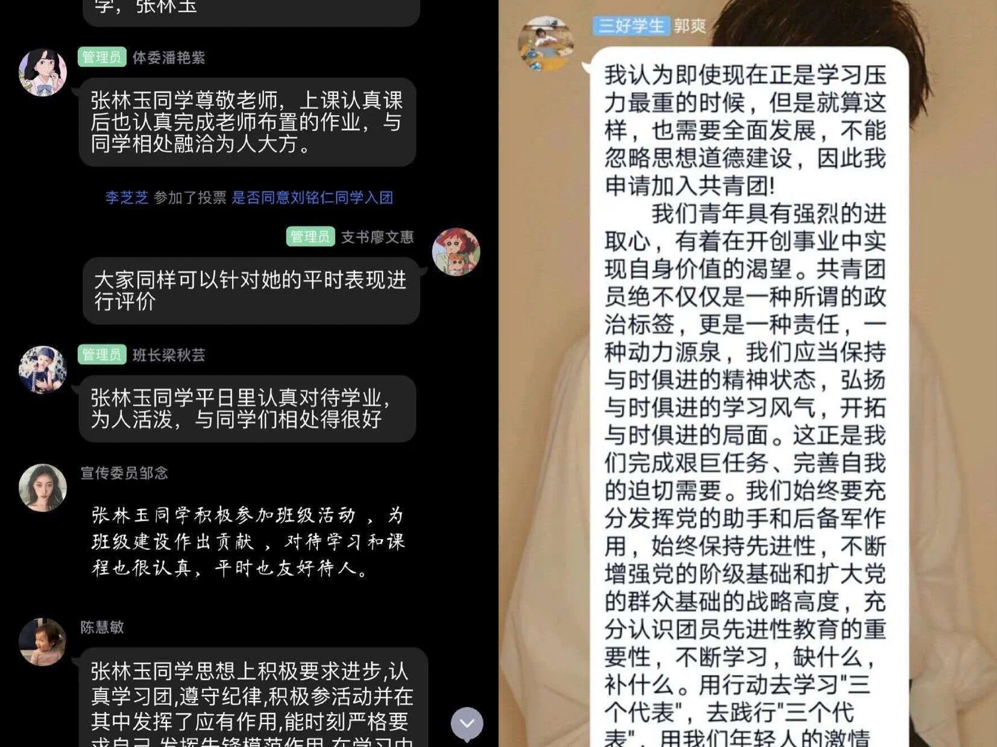 新晋预备团员积极地表达自己入团的愿望,分享自己对时代精神及中国特色社会主义核心价值观的理解与看法。各班团支书,班级干部通过投票、热烈反馈的方式表达了对新团员的美好期望。