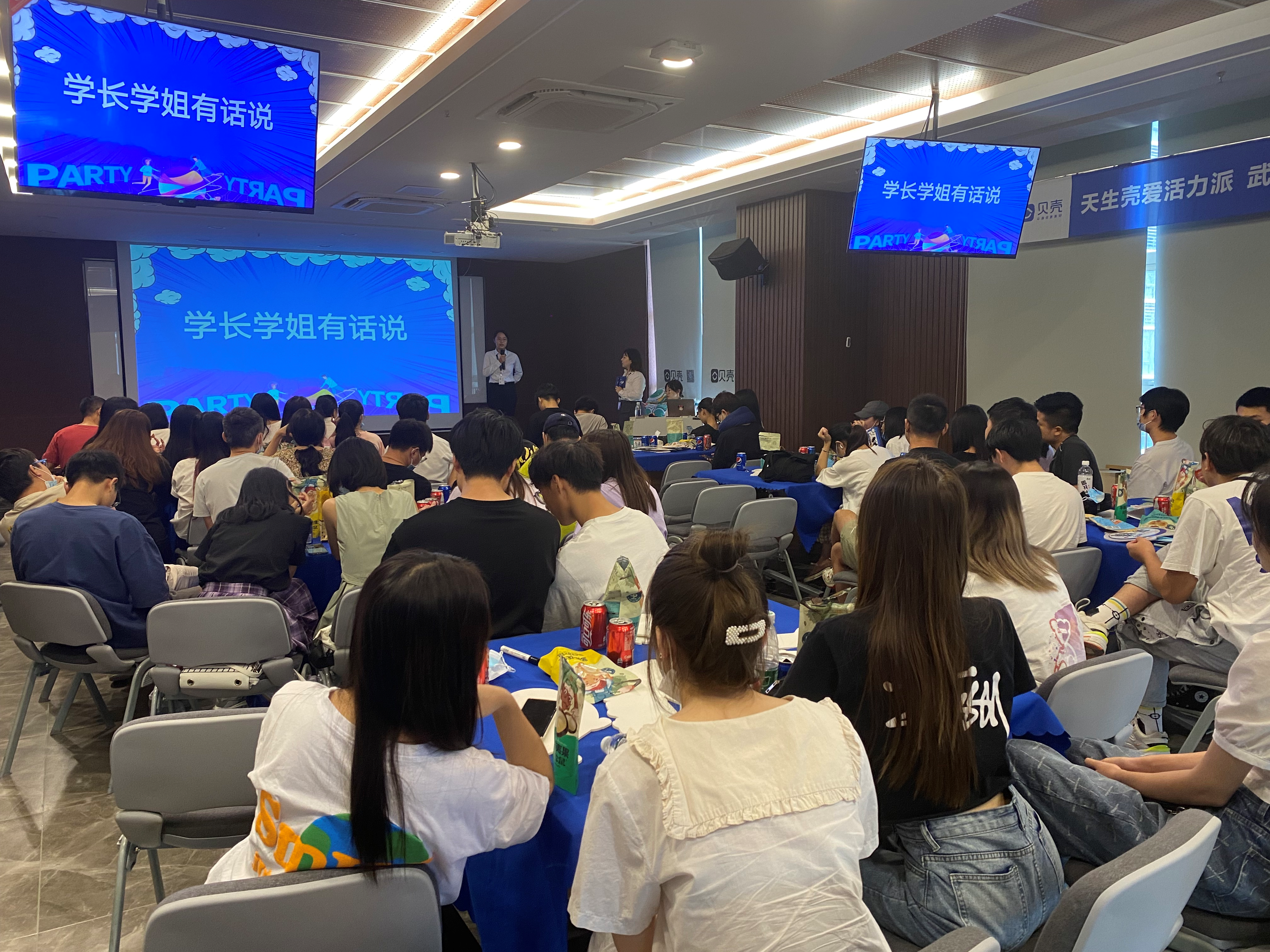 随后,武汉贝壳两名优秀员工、公司2021届国际经济与贸易专业毕业生范天伦和市场营销专业毕业生胡子仙,以学姐学长的身份与同学们一起分享了他们选择贝壳的原因、初入职场的困惑和现如今如鱼得水的自信,勉励学弟学妹们在毕业季能够做好选择,做对选择。