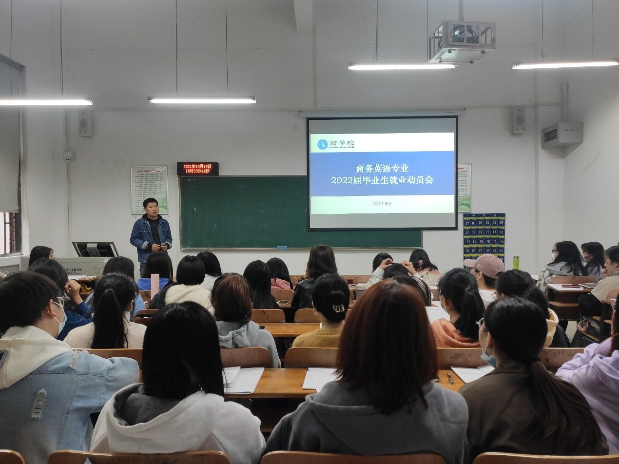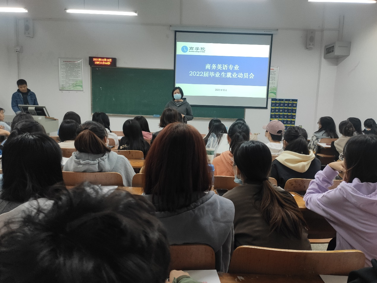 本网讯(通讯员 陈维)为进一步做好2022届毕业生就业工作,商公司于10月19日下午3:20在临湖轩A1039召开2022届商务英语专业毕业生就业动员会。会议由毕业班辅导员陈维主持,商务英语系系主任李卉琼、副主任张希老师和2022届商务英语专业全体毕业生参会。