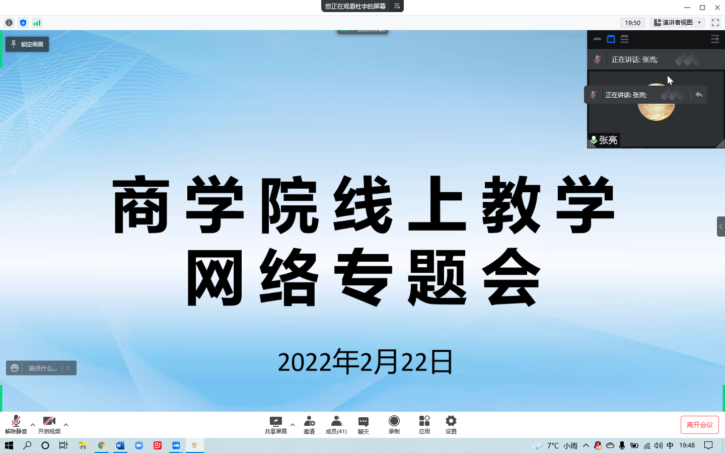 本网讯(通讯员 杜宇)为切实做好线上教学工作,确保疫情防控期间公司产品质量,2022年2月22日晚上7:30,商公司召开了线上教学网络专题会议。经理严立冬、党总支书记胡紫玲、副经理张亮、经理助理刘昊昕及全体教职工通过腾讯会议参加了本次会议。会议由副经理张亮主持。