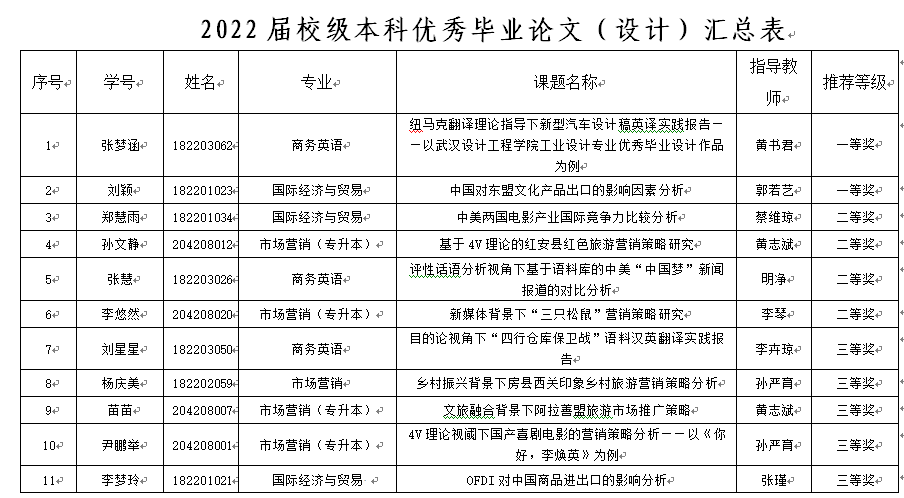 根据公司教务处下发的《关于开展2022届校级本科优秀毕业论文(设计)评选工作的通知》(武设教[2022]16号)文件精神及《商公司2022届校级本科优秀毕业论文(设计)评选方案》相关要求,经公司各专业初评推荐,公司校内外评审专家组评审,拟向公司推荐11项2022届校级优秀毕业论文(设计),现予以公示。